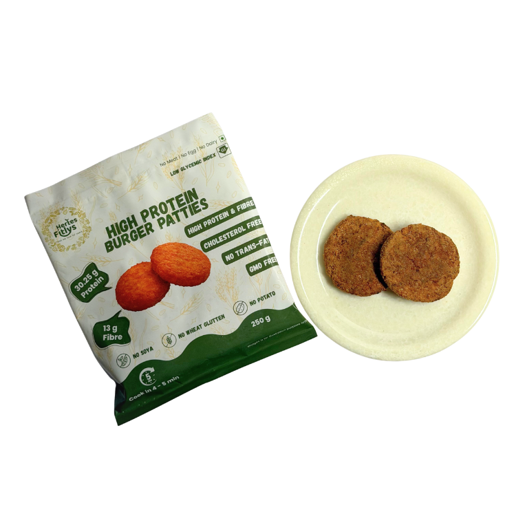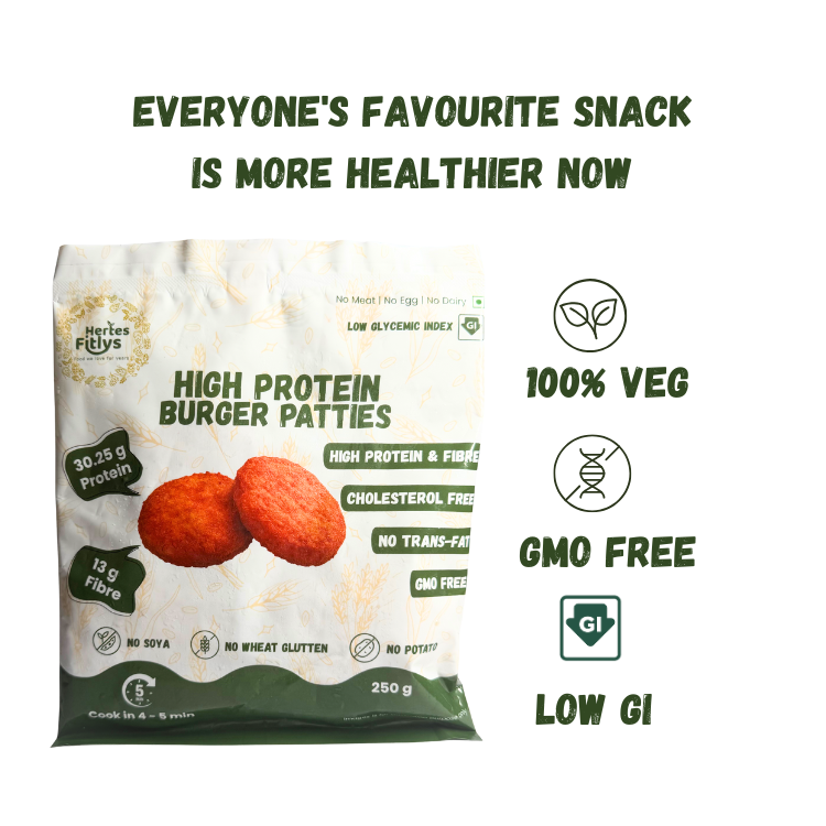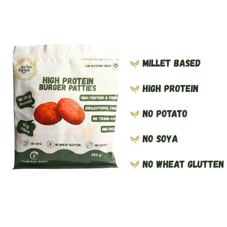 Elevate your burger experience with Hertes Fitlys Millet Burger Patties. Made with nutrient-rich millets, Pea Protein, and wholesome spices. These patties offer a delicious, protein-packed alternative to traditional burgers. Perfect for health-conscious food lovers seeking convenient, ready-to-cook options without compromising on taste.