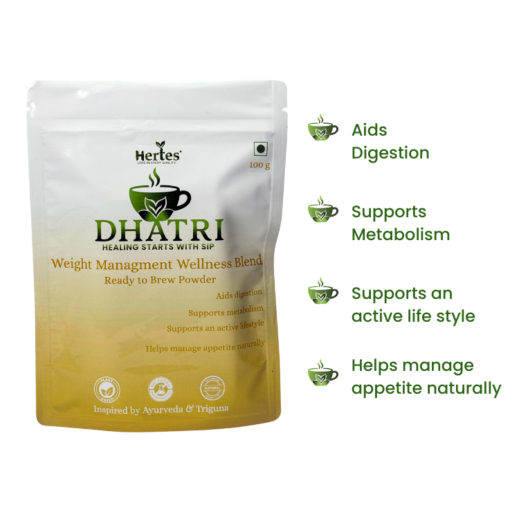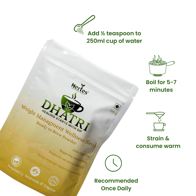 Dhatri Weight Management Wellness Blend is a light, refreshing herbal infusion made using traditional kitchen herbs and spices. Crafted for daily wellness routines, it supports digestion, metabolism, and mindful weight management when consumed as part of a balanced diet and active lifestyle. Thoughtfully prepared, it blends tradition with everyday wellness.