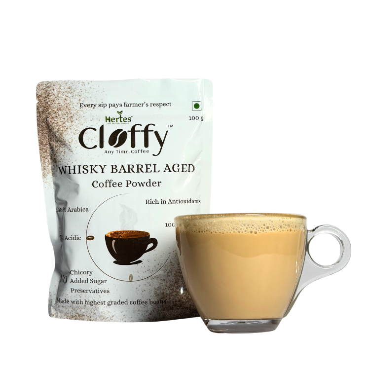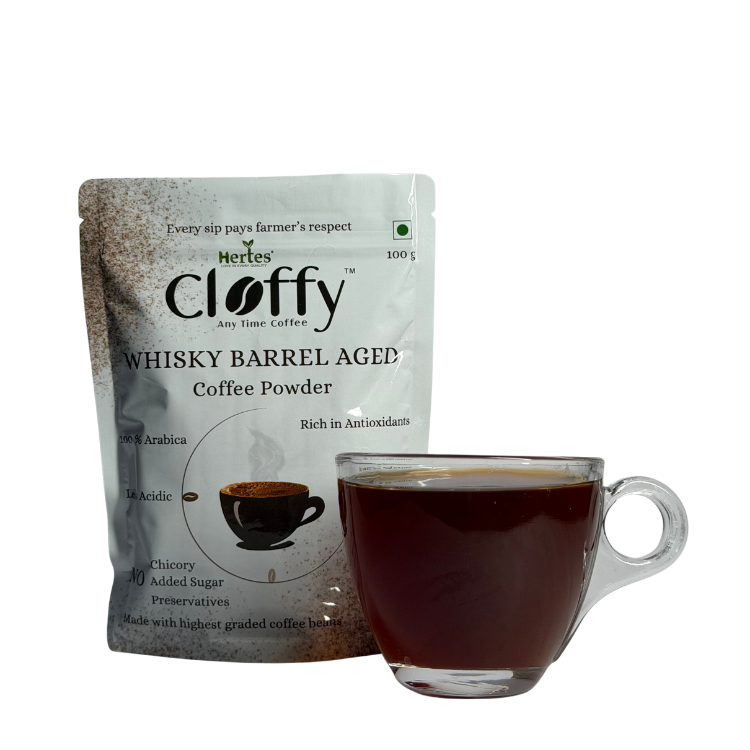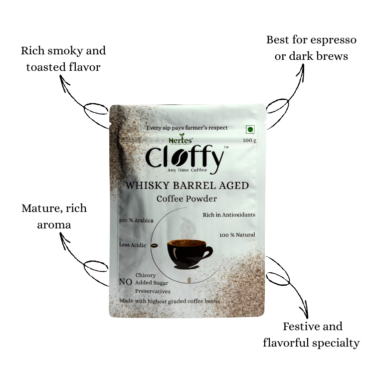 Experience the distinctive taste of Hertes Cloffy Whiskey Barrel Aged Coffee Powder. Crafted from AA+, handpicked coffee beans aged in whiskey barrels, this blend offers a smooth, full-bodied coffee with smoky, oaky notes without any alcohol. Perfect for adventurous coffee lovers seeking a bold and unique flavor.
